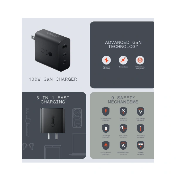 100 W total output: Capable of charging high-demand devices like laptops, tablets, and phones.