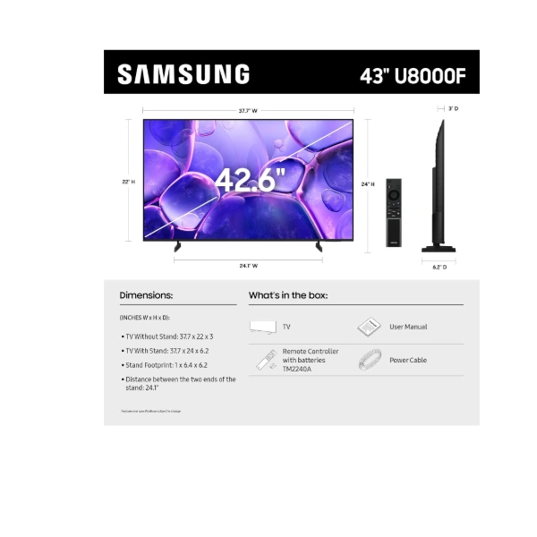 Sleek 43″ 4K Smart TV with Crystal UHD display, HDR10+, and Tizen OS for stunning color and effortless streaming.